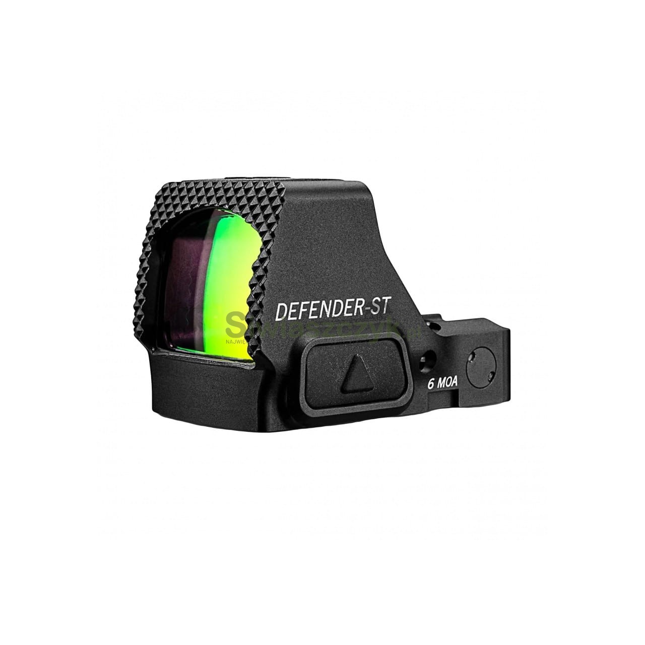 Vortex Defender-ST ma wysokiej jakości soczewkę pokrytą wielowarstwowymi powłokami antyrefleksyjnymi, które zapewniają wysoką transmisję światła oraz czysty i ostry obraz pozbawiony błędu paralaksy. Celownik wyróżnia się nie tylko jedną z największych soczewek w swojej klasie, ale także asferycznym profilem optyki. Zapewnia to krystaliczną ostrość obrazu nie tylko w centrum, ale również na obrzeżach. W rezultacie uzyskujemy jasny wyraźny obraz celu i możemy komfortowo strzelać także przy słabym oświetleniu. Znakiem celowniczym jest czerwona kropka o wielkości 3 lub 6 MOA (w zależności od modelu) o wartości kliku 1 MOA, regulowana w zakresie 115/145 MOA (poziom/pion). Twarda powłoka Armortek chroni soczewkę przed zarysowaniami i innymi czynnikami zewnętrznymi.
