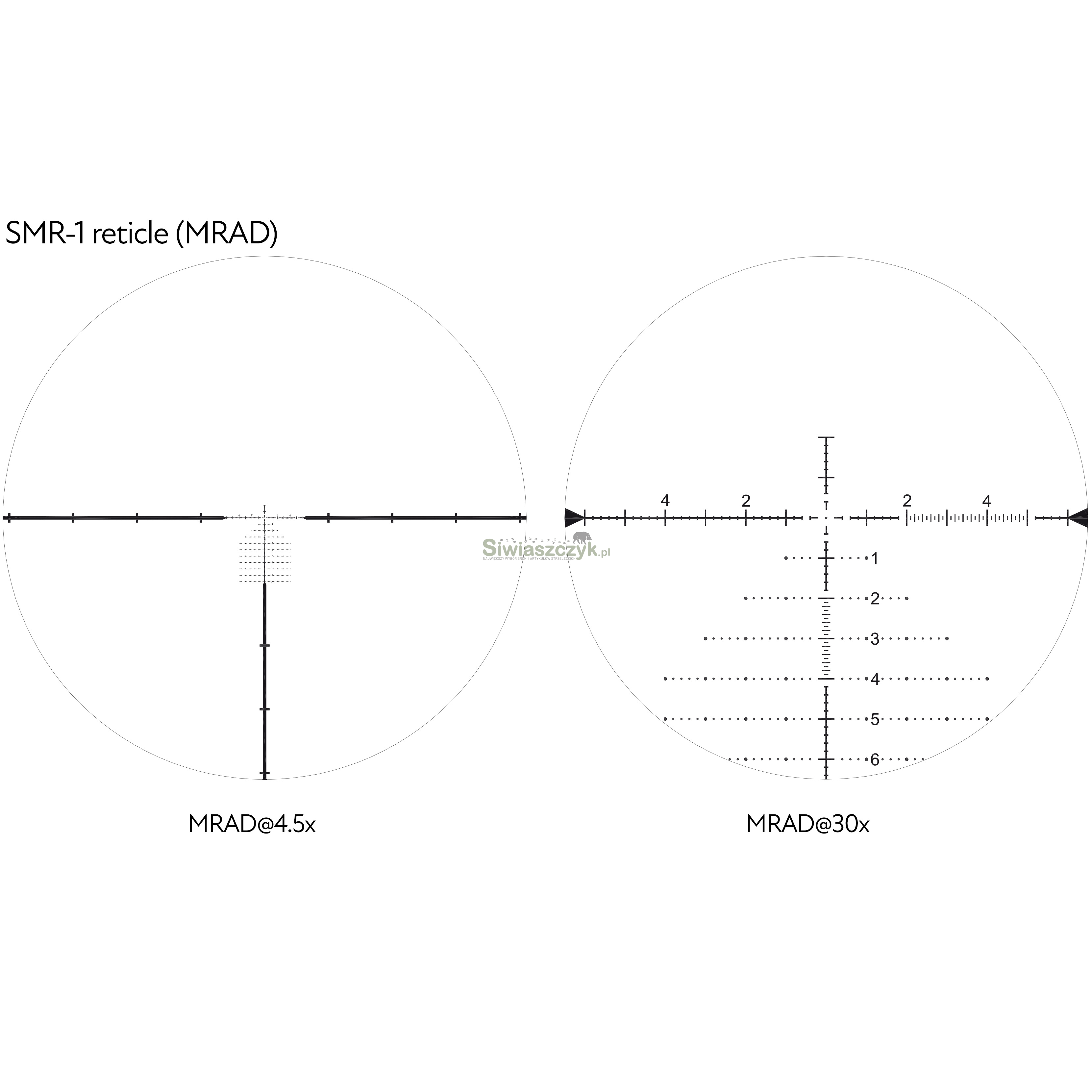 SMR-1 jest siatką typu taktycznego wykonaną na potrzeby strzelców długodystansowych i zawodników PRS, jednak dzięki podświetlanemu środkowi siatka ta jest idealna także do polowań przy słabym oświetleniu. Siatka charakteryzuje się czystym górnym polem, pływająca kropką centralną, znacznikami 0,2MRAD oraz zintegrowana linijką w pionie i poziomie ze znacznikami 0,1 MRAD dla łatwiejszego pomiaru celu. Część "choinkowa" ma znaczniki 0,2 MRAD do pomiaru odległości, pomiaru odchylenia na wiatr i derywację. Liczby do pomiaru kolejnych belek są umieszczone 1,2 MRAD na prawo od środka, aby można je było łatwo zauważyć podczas liczenia belek, ale wciąż na tyle daleko od środka, aby nie zakryć celu w najbardziej krytycznych miejscach siatki.