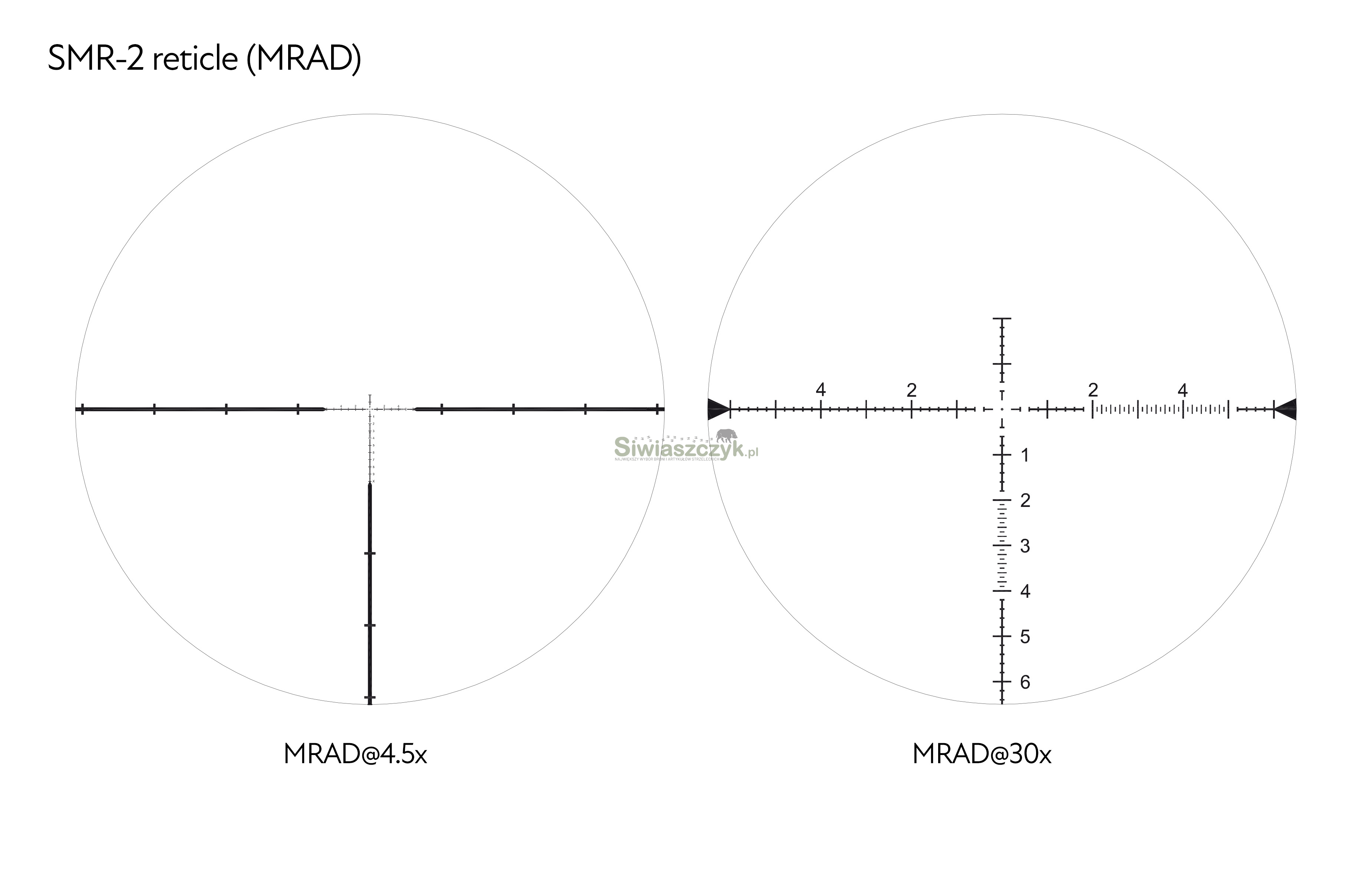 SMR-2 to uproszczona wersja klasycznej siatki SMR-1 bez „choinki”, ale nadal ze zintegrowaną linijką 0,2 / 0,1 MRAD, centralnym podświetleniem i pełnym układem siatkowym w pierwszym planie ogniskowym (powiększa się razem z obrazem). Pozwala to na pomiar, obserwację i korektę – pracując bezpośrednio na obrazie celu, bez potrzeby używania dodatkowego dystansemierza.