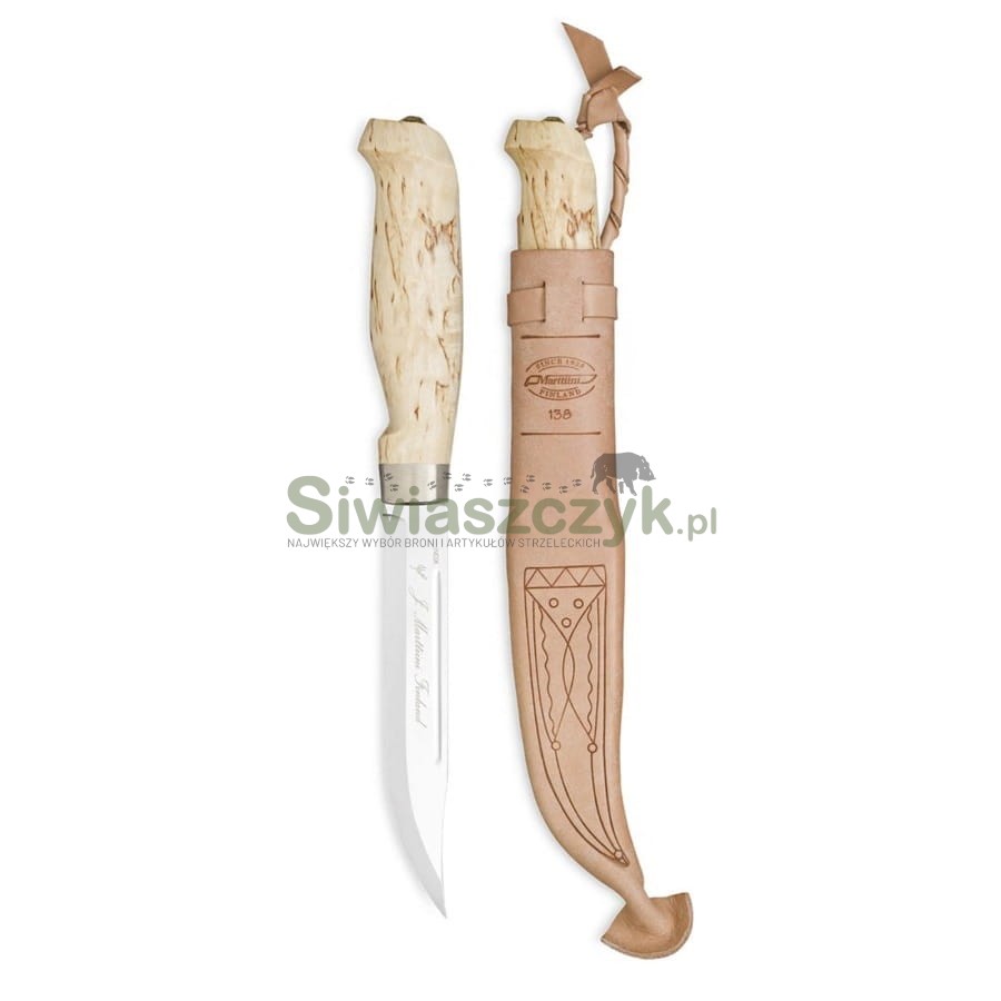 Ostrze o długości 130 mm wykonano ze stali nierdzewnej hartowanej do twardości HRC 53-55. Dzięki polerowanemu wykończeniu nie tylko prezentuje się wyjątkowo, ale także zapewnia gładkie i precyzyjne cięcie. Rękojeść z fińskiej brzozy doskonale układa się w dłoni, a mosiężny jelec i tulejka nadają całości eleganckiego charakteru oraz zwiększają trwałość konstrukcji. W zestawie znajduje się wysokiej jakości skórzana pochwa, umożliwiająca bezpieczne przenoszenie noża.