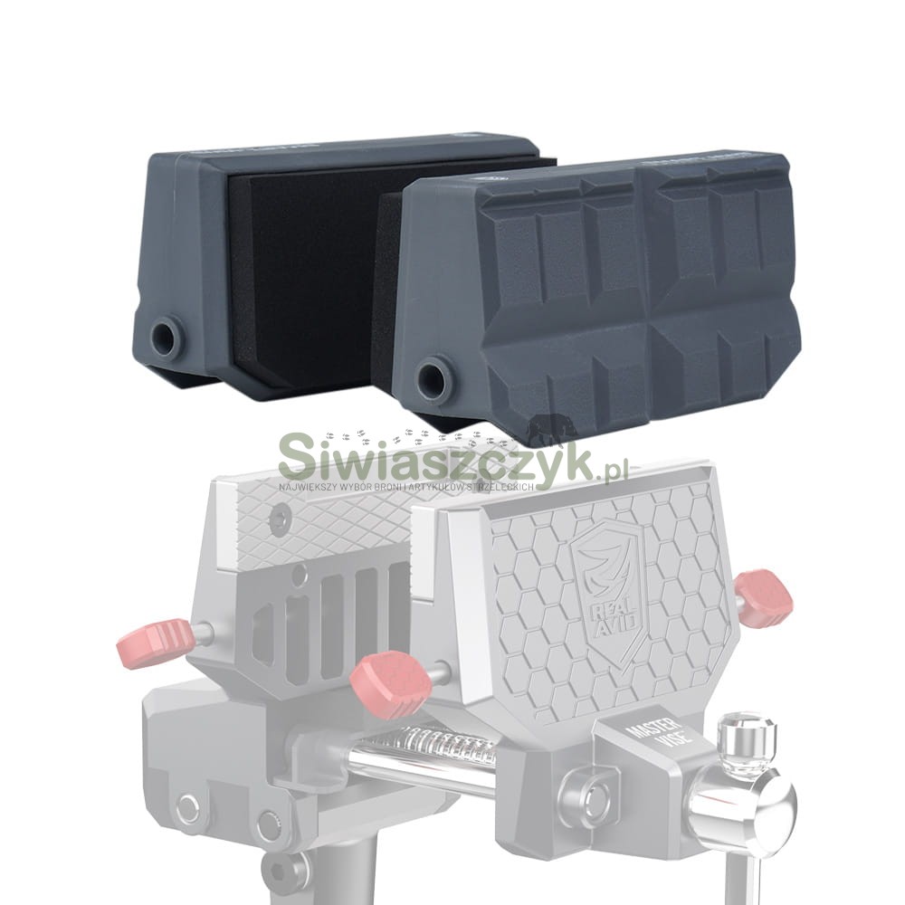 Szczęki wykonano z wytrzymałego nylonu połączonego z półsztywną pianką, co łączy sztywność i odporność konstrukcji z ochroną delikatnych powierzchni. System montażowy jest zgodny z istniejącymi rozwiązaniami imadeł Real Avid, dzięki czemu montaż i wymiana okładzin są szybkie i intuicyjne. Model Gun‑Fit oferuje dwie różne powierzchnie robocze: teksturowaną stronę z rzędami wypukłych prostokątów dla pewnego chwytu oraz stronę z gniazdem wypełnionym miękką pianką dla maksymalnej ochrony przedmiotów o nieregularnych kształtach.