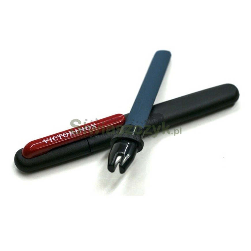 Poręczna ostrzałka firmy Victorinox 2 w 1 wielkości długopisu o uniwersalnym zastosowaniu.