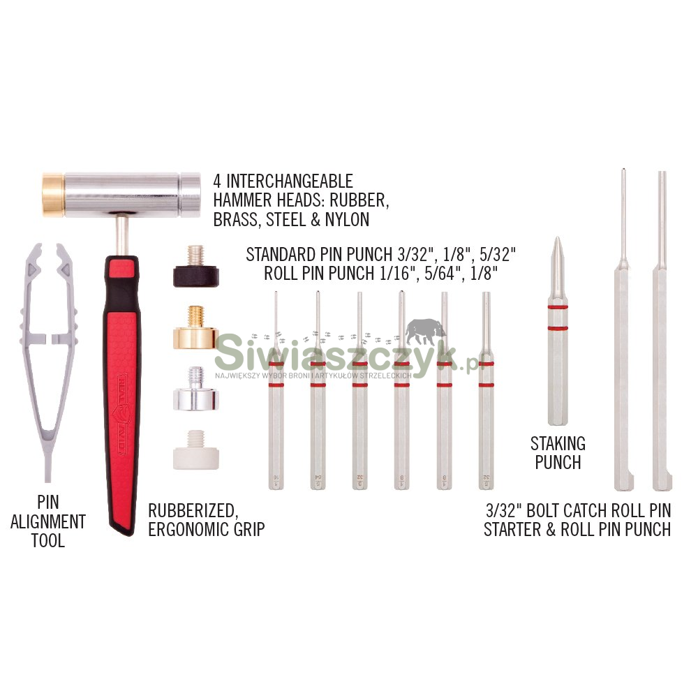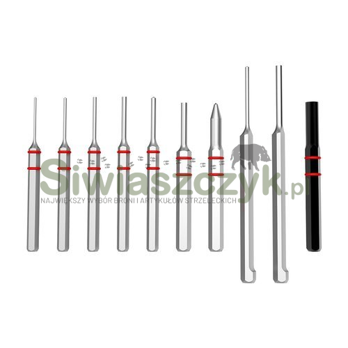 - 10 wybijaków różnej wielkości, wykonanych z niklowanej stali, do wszystkich wybijanych elementów broni: 3/32″, 1/8″, 9/64″, 5/32″ Standard Pin, 1/16″, 5/64″, 1/8″ Roll Pin, 3/32″ Bolt Catch Roll Pin, punktak, nieuszkadzający dobijak